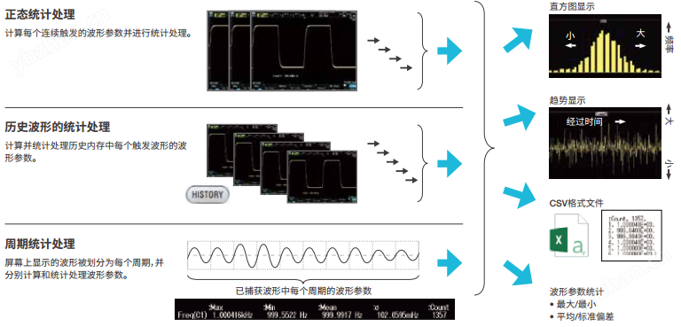 最多支持30个同步自动测量?;箍闪?、逐周期或使用历史存 储功能来测量统计值。此外,逐周期参数测量还可以计算已捕 获波形的波动。