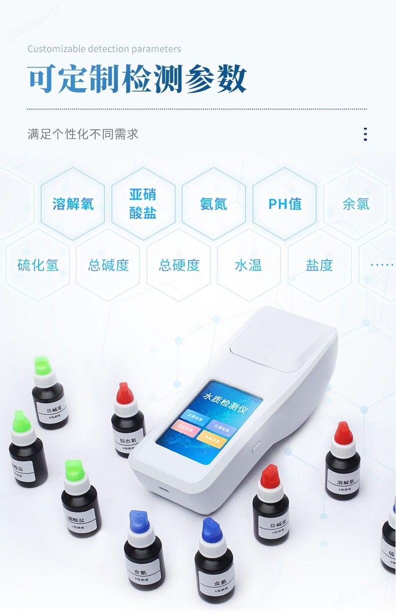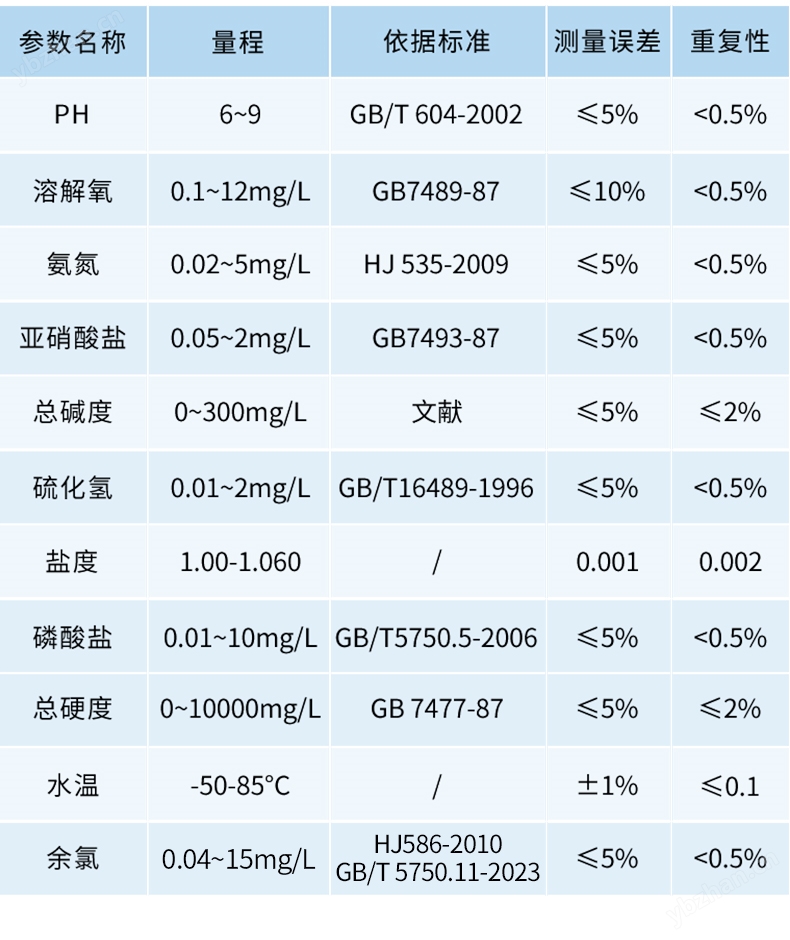氨氮、亚硝酸盐、余氯、总氯、二氧化氯、亚氯酸盐、臭氧、pH、溶解氧、硫化氢、磷酸盐、硫酸盐、尿素、氰尿酸、总硬度、总碱度、浊度、悬浮物、水温、盐度、氯化物、色度、有效氯、锌、铜、总铁、六价铬等近30种检测指标任选12项;