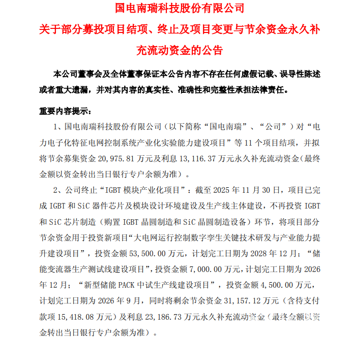 仪表网 企业动态】12月12日,国电南瑞(SH 600406)披露关于部分募投项目结项、终止及项目变更与节余资金永久补充流动资金的公告。公司对“电力电子化特征电网