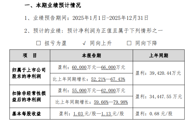 【仪表网 行业财报】1月16日,科士达(002518.SZ)发布2025年度业绩预告,预计2025年全年归属于上市公司股东的净利润为60000万元-66000万元,同比预增52.21%-67.43%;预计2025年全年归属于上市公司股东的扣除非经常性损益的净利润为55000万元-62000万元,同比预增59.66%-79.98%。