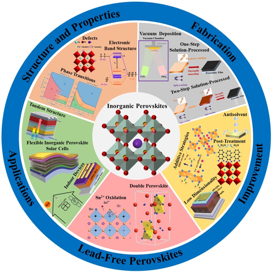 在本综述中,团队从无机钙钛矿的结构特征、晶体相及光电性能出发,讨论了无机钙钛矿薄膜常用的制备方法,包括溶液法、真空沉积法,以及二者结合的混合制备策略,并分析了不同制备工艺对薄膜质量和器件性能的影响。针对相不稳定性和缺陷形成等关键问题,团队介绍了近年来在组分工程、添加剂调控和界面修饰方面取得的重要研究进展。鉴于铅元素使用所带来的环境与健康风险,团队探讨了铋基、锡基和锑基等无铅钙钛矿材料体系的优缺点。此外,团队还总结了大面积及柔性全无机钙钛矿太阳能电池的研究进展,并分析了其在极端环境条件下的潜在应用前景。