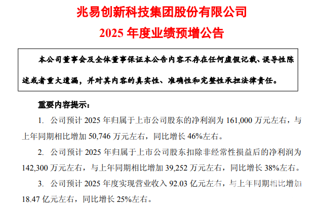仪表网 行业财报】1月22日,兆易创新(603986)披露2025年业绩预告。公司预计2025年归属于上市公司股东的净利润为16.1亿元左右,同比增长46%左右。预计扣除非经常性损益后的净利润为14.23亿元左右,同比增长 38%左右。预计2025年度实现营业收入92.03亿元左右,同比增长25%左右。