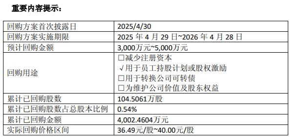 截止到2026年1月31日,公司通过上海证券交易所交易系统以集中竞价交易方式共回购公司股份1,045,061股,占公司总股本193,874,417股的比例为0.54%,回购成交的最高价为40.00元/股,最低价为36.49元/股,支付的资金总额为人民币40,024,603.64元(含印花税、交易佣金等交易费用)。本次回购符合相关法律法规规定及公司回购方案的要求。
