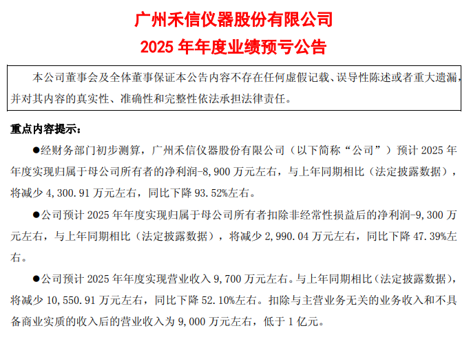 仪表网 行业财报】1月30日,禾信仪器(688622)披露2025年度业绩预告,预计2025年实现营业收入9700万元,同比下降52.1%左右;归母净利润亏损8900万元,上年同期亏损4599.09万元,同比下降93.52%左右;扣非净利润亏损9300万元,上年同期亏损6309.96万元,同比下降47.39%左右。