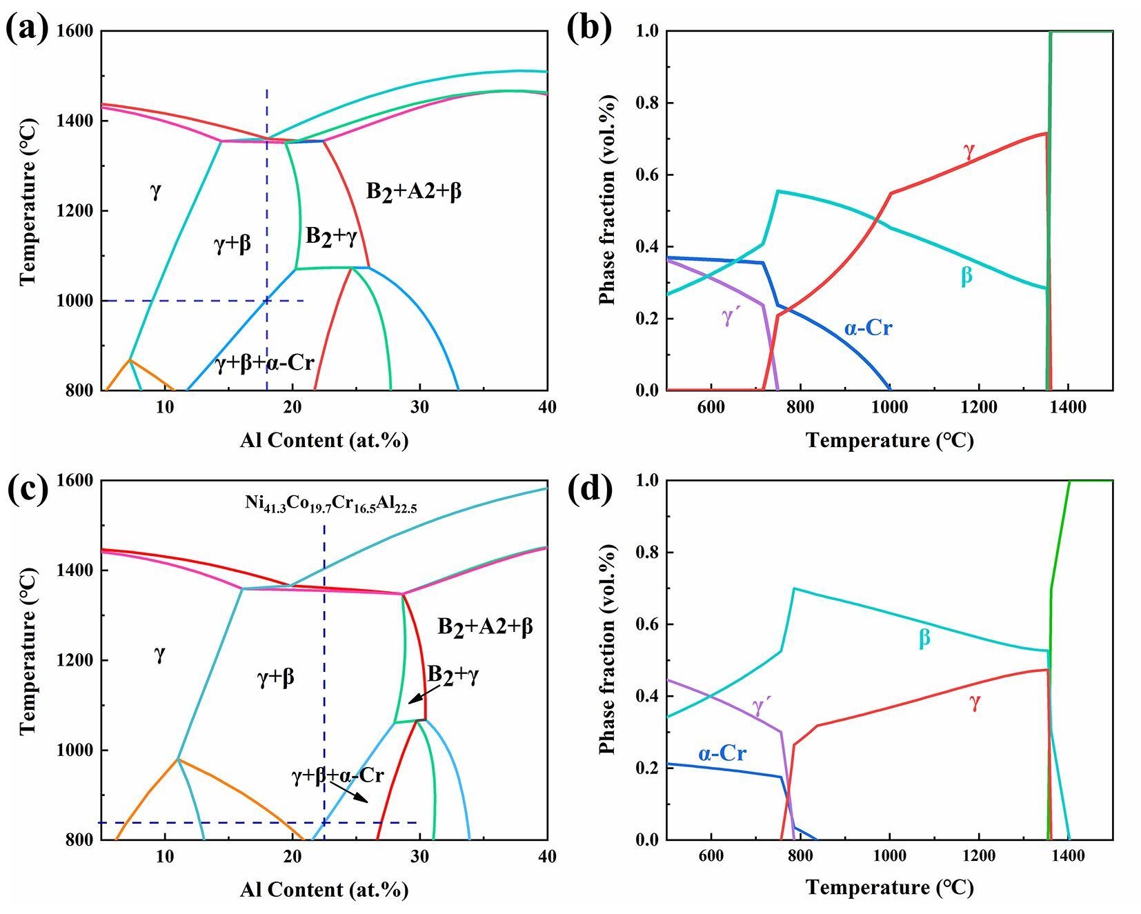 图1:共晶多主元合金的设计:(a) Ni50-xCo25Cr25Alx体系的伪二元相图;(b) 共晶多主元合金Ni32Co25Cr25Al18的平衡相随温度的分数;(c) 商用MCrAlY合金体系 Ni63.8-xCo19.7Cr16.5Alx 的伪二元相图;(d) 商用MCrAlY合金 (Ni41.3Co19.7Cr16.5Al22.5) 的平衡相随温度的分数。