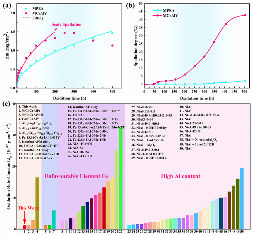 基于上述策略,团队成功研制出新型NiCoCrAlYHf多主元合金(Multi-Principal Element Alloy, MPEA)。在 1200℃、500 小时的等温氧化实验中,新型合金的氧化增重显著低于传统合金,其氧化速率常数仅为 1.28×10?¹² g²·cm??·s?¹,比传统合金低约 59%。更为重要的是,在循环氧化测试中,传统合金在 70 小时后就出现氧化膜剥落,500 小时后剥落面积超过 40%,而新型合金在整个测试周期内剥落面积小于 2%,展现出卓越的膜层结合力与抗剥落性能。这一进展为发展下一代能在极端温度下稳定服役的热障涂层粘结层材料,奠定了关键的材料基础与设计范式。