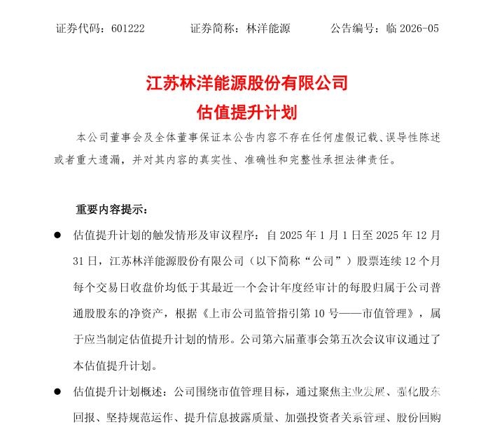 【仪表网 企业动态】2026年2月9日,江苏林洋能源股份有限公司(股票代码:601222)正式发布估值提升计划公告,同步披露第四期股份回购、控股股东增持及股份注销等多项配套举措,旨在改善公司股票连续破净现状,提升公司投资价值,切实维护股东权益。