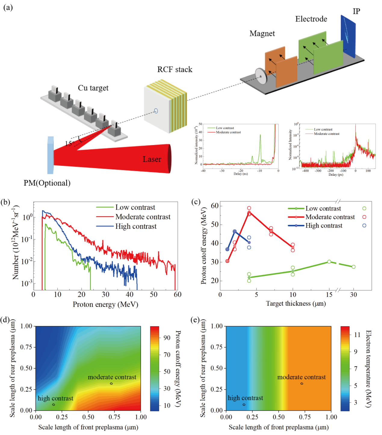 图1 (a) 实验布置示意图,插图是激光的纳秒和皮秒对比度;(b)-(c) 不同对比度激光加速质子结果:(b)质子能谱,(c)不同靶厚的质子截止能量;(d)-(e) 质子截止能量和电子温度随靶前和靶后预等离子体标长变化的模拟结果。