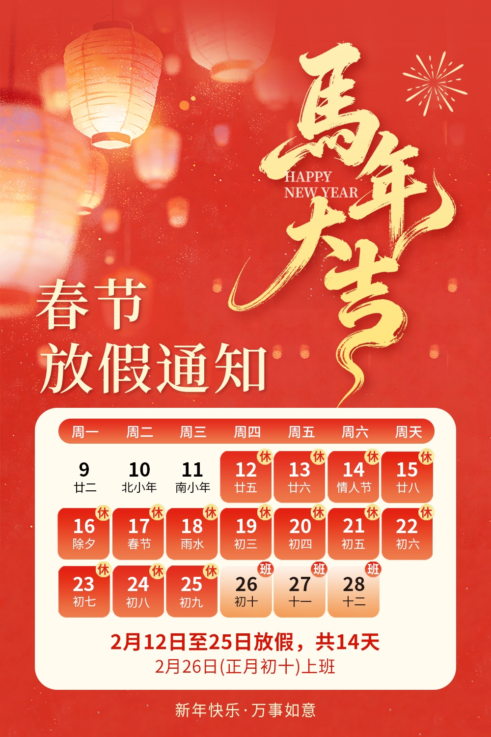 一、仪表网2026年春节放假时间为:2026年02月12日-2026年02月25日,共14天。2月26日(正月初十)正常上班。