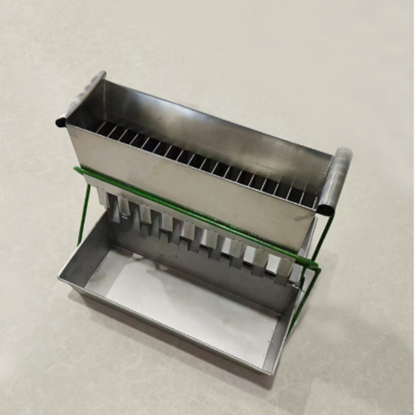 1、在使用时,将二分器按要求安装,放在平坦的平台上,接料斗放在接料位置,然后用铲料簸箕将物料均匀的倒入二分器的上部进料格槽,一边倾倒物料,一边左右移动簸箕,确保物料在二分器全部格槽都可以接收物料,可以不断放入物料,直到接料斗满为止,但不要让物料溢出接料斗。