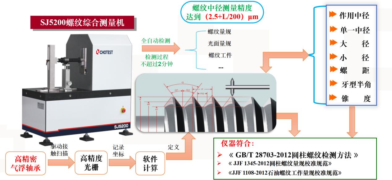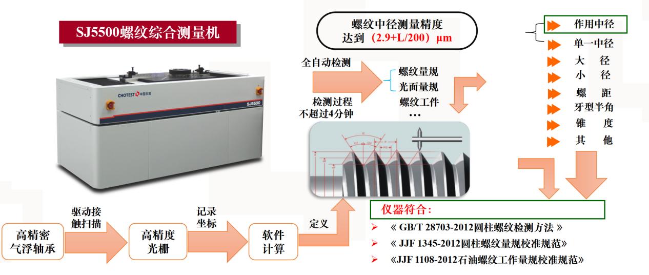 SJ5000系列螺纹综合测量机目前有SJ5200和SJ5500两款型号,螺纹中径测量精度分别是(2.5+L/200)μm、(2.9+L/200)μm。